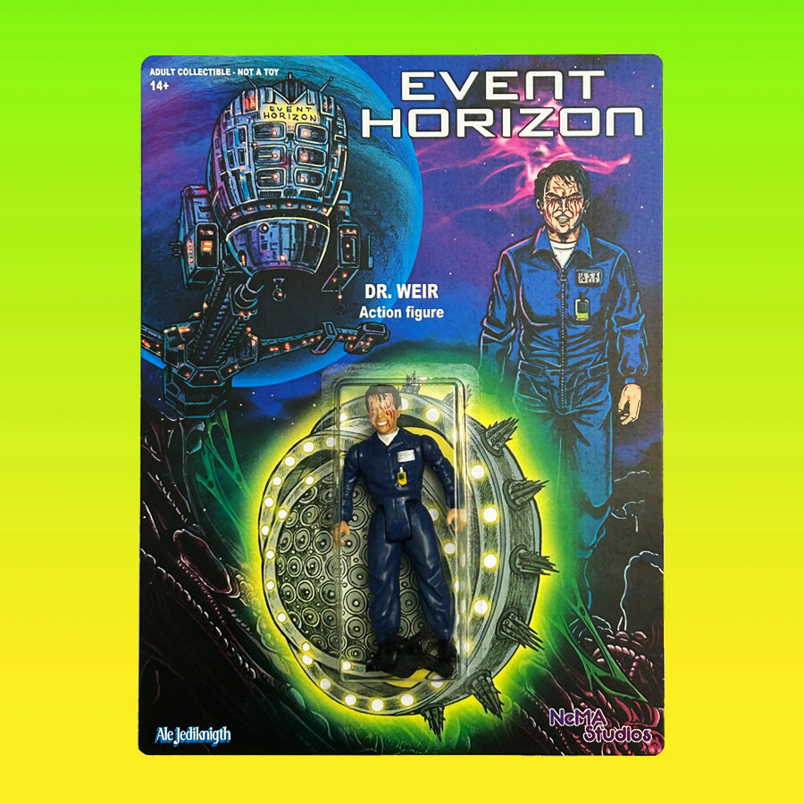 Presenting Dr. Weir from the 1997 sci-fi classic Event Horizon in the classic Kenner Aliens style. Dr. Weir stands at 4.5" tall, features 5 POA and a nail blaster! comes packaged on original artwork by Ale Jediknigth.